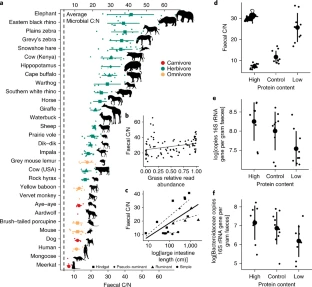 Hier eine Studie, wo die Kohlenstoff-/Stickstoff-Verhältnisse der Ausscheidungen von 30 Säugetieren verglichen werden. Im Vergleich zu Menschen haben nur Erdmaennchen und Meerkatzen ein krasseres C-/N-Verhaeltnis: